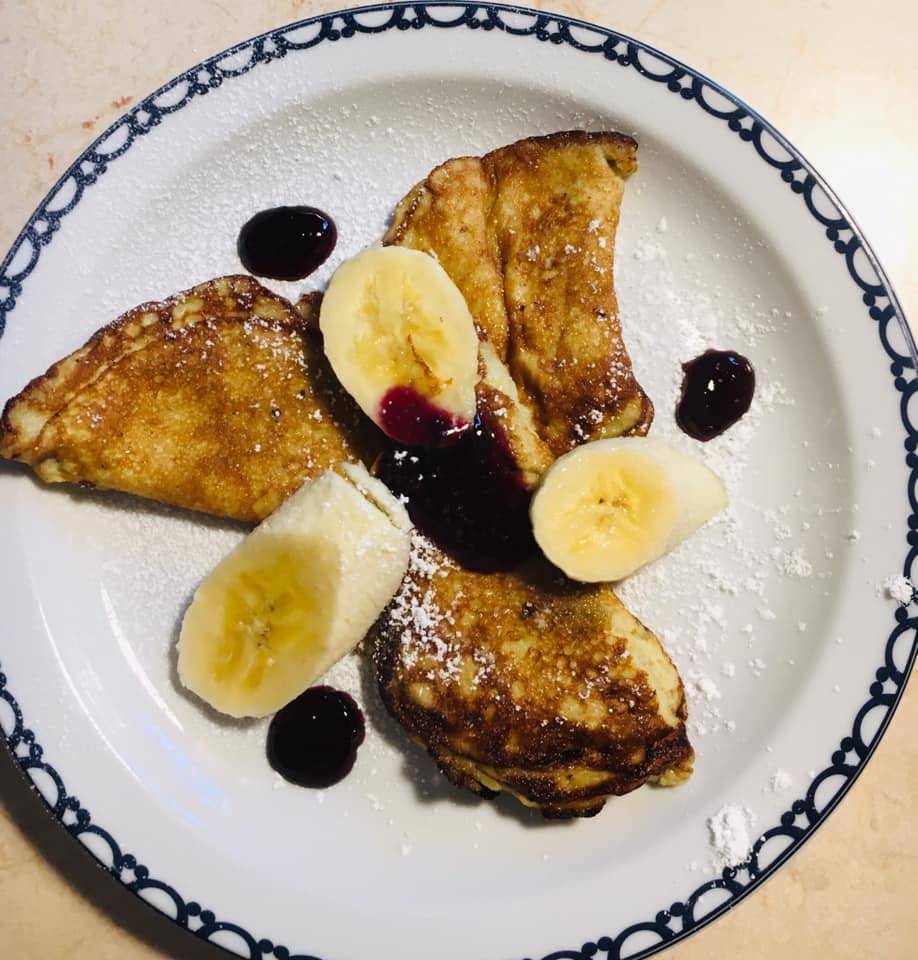 I’m all for easy so when I saw this recipe I had to give it a try. The texture is delicate and airy. Cook over medium heat and flip with a very thin spatula for best results. I used my Ikea flipper which was a bit too thick and couldn’t quite get it to flip the whole pancake in one go. Even so, it tastes good and I folded it to look like a crepe (to hide the broken middles), dusted it with confectioner’s sugar, added more banana and a couple dollops blueberry jam.